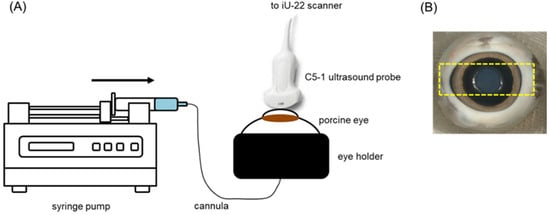 (A) Experimental setup used in USMB experiments. (B) Image of a porcine eye. Yellow rectangle indicates the orientation of the C5-1 probe during ultrasound imaging and USMB treatment.