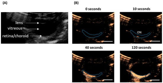 (A) Ocular structures of a porcine eye as imaged with ultrasound in B-mode. (B) Time-lapse ultrasound contrast images of porcine eye during injection of microbubbles. Ten seconds after injection, microbubbles enter the posterior segment of the eye in the area of the optic nerve head. Two minutes after injection, microbubbles circulate in the retina and choroid. Blue dotted line indicates the retina and choroid, scale bar: 1 cm.