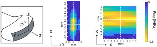 Pressure field maps of the C5-1 probe measured in PW Doppler mode. Middle: transversal plane, right: axial plane. Adapted from [28].