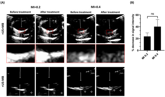 (A) Ultrasound contrast images from porcine eyes treated with UMSB (+US+MB) or ultrasound only (+US−MB) at MI 0.2 and 0.4. Red boxes indicate enlargement of the focal area of the probe. Contrast signal was minimally (MI 0.2) and strongly (MI 0.4) decreased after USMB treatment. Distance between the two crosses is 1 cm. (B) Percentage of decrease in signal intensity of microbubbles within the PW Doppler cursor area after treatment with USMB at MI 0.2 and 0.4 (n = 4), ns: not significant.