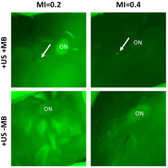 Macroscopic images of retina flat mounts of eyes during excitation with a green fluorescent light. Top: eyes treated with USMB (left: MI 0.2, right: MI 0.4), bottom: eyes exposed to ultrasound but no microbubbles. White arrows indicate the spots where SYTOXTM green-positive cells were present. Retinal detachment is an artefact of flat mount preparation. ON: optic nerve head.