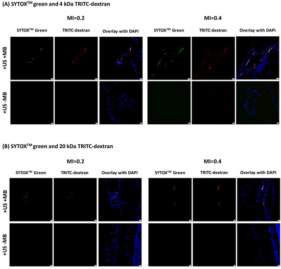 Fluorescence microscopy images showing intracellular accumulation of (A) SYTOXTM green and 4 kDa TRITC-dextran and (B) SYTOXTM green and 20 kDa TRITC-dextran after exposure to USMB. “TRITC” indicates a fluorophore with red color. Blue in overlay images: DAPI, scale bar: 10 μm.