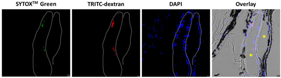 Tissue sections were imaged using a fluorescence confocal microscope (Leica TCS SP8X, Leica, Amsterdam, The Netherlands) in four channels (excitation 360 nm; emission 410–480 nm for DAPI, excitation 504 nm; emission 515–546 nm for SYTOXTM green, excitation 550 nm; emission 565–650 nm for TRITC-dextrans, and phase contrast, 63× objective, image format 2048 × 2048 pixels; speed: 100; line average: 4).