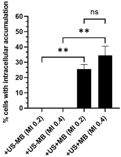 Statistical analysis was performed using the GraphPad Prism software (version 8.0.1, GraphPad, San Diego, CA, USA), assuming that the samples follow non-parametric distribution. Statistically significant differences in the percentage of cells with intracellular accumulation were calculated between USMB-treated and samples treated only with ultrasound using Mann–Whitney test. Data in the graphs are shown as mean ± SEM. Statistically significant differences between groups are annotated with asterisks by using * for p < 0.05 and ** for p < 0.005.