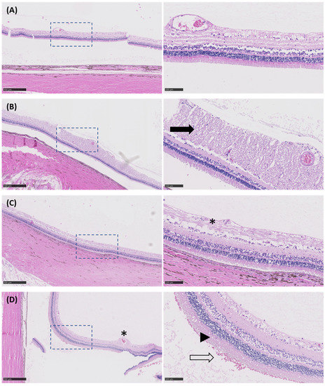 Microphotographs of H&E-stained sections from eyes exposed to different USMB conditions. Images on the right (20× magnification, scale bar: 100 μm) are high magnification views of dashed-line boxes shown on the left (5× magnification, scale bar: 500 μm). (A) Untreated eye (i.e., no USMB) with no signs of retinal damage. (B) Eye treated with USMB at MI 0.2 showing some edematous changes (black arrow) in the proximity of the optic nerve. (C) In the eye treated with USMB at MI 0.4, focal degenerative vacuolization with fibrinous exudate was observed (asterisk). (D) The most pronounced damage was seen in the eye treated with USMB at MI 0.8. Focal degenerative vacuolization with fibrinous exudate was seen around the retinal blood vessel (asterisk), erythrocytes were present in the subretinal space (hollow arrow) and loss of cell boundaries was seen in the photoreceptor layer (arrowhead).