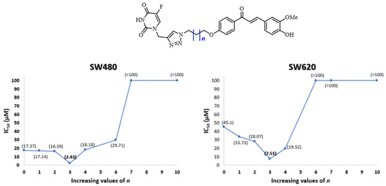 3.2.2. Antiproliferative Effect of 5-FU/Curcumin Hybrids on SW480 and SW620 Cells