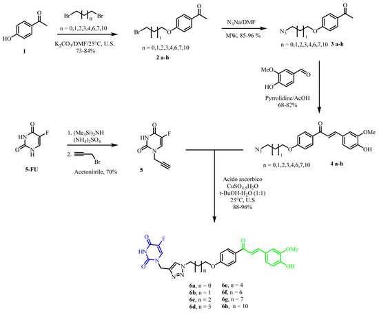 - Cardona-G, W.; Herrera-R, A.; Castrillón-L, W.; Ramírez-Malule, H. Chemistry and Anticancer Activity of Hybrid Molecules and Derivatives Based on 5-Fluorouracil. Curr. Med. Chem. 2021, 51, 5551–5601. [Google Scholar] [CrossRef] [PubMed]