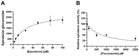 (A) Michaelis–Menten Kinetics of epirubicin by formation of epirubicin glucuronide in HLMs (R2 = 0.96). Pooled HLMs (2 mg/mL) were incubated for 2 h with incremental amounts of epirubicin (between 2.5–100 µM) and epirubicin glucuronide was detected in the absence of standards. (B) Normalised activity of epirubicin by inhibition of epirubicin glucuronide formation in HLMs. HLMs were incubated for 2 h with 25 µM epirubicin and increasing amounts of fluconazole (between 10–2500 µM). Epirubicin glucuronide was detected, and response was measured relative to the control in the absence of fluconazole. Mean peak area response ± S.D. is measured in arbitrary units. Data were generated in duplicate with standard deviation displayed by error bars.