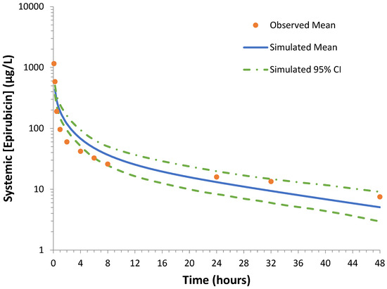 The accuracy of the epirubicin compound profile was assessed using an age-, sex-, and race-matched single-dose trial [34]. Ten simulated trials were performed with epirubicin administered IV at a dose of 50 mg/m2 in trials comprising 9 female subjects aged between 20 and 50 years. Epirubicin plasma concentration, monitored over 48 h, was used to define the simulated epirubicin maximal concentration Cmax and AUC. The mean (±SD) simulated AUC and Cmax in the validation cohort were 1324 ± 20.0 ng/mL·h and 434 ± 42.6 ng/mL, respectively; these values are 1.1- and 1.6-fold higher than the respective measured parameters. The simulated mean (95% confidence interval; CI) and mean observed plasma concentration time profiles are shown in Figure 2. In all cases, the mean simulated epirubicin plasma concentration at each measured time point was within 1.6-fold of the respective observed plasma concentration.