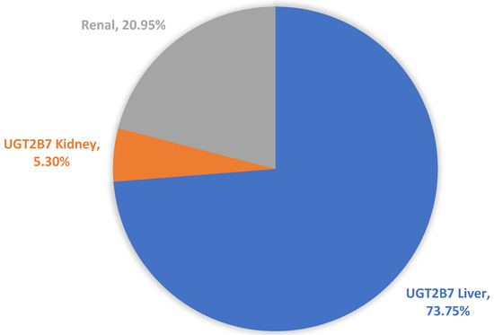 The mean contribution of renal elimination, defined by the fraction of epirubicin excreted unchanged in the urine (Fe), was 20.95%. The mean contributions of hepatic and renal UGT2B7 to total epirubicin clearance were 75.3% and 4.3%, respectively (Figure 3).