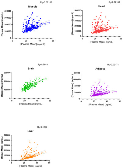 The concordance between simulated epirubicin plasma and individual tissue concentrations are shown in Figure 5. Except for epirubicin concentration in the brain (R2 = 0.56), there was limited concordance between epirubicin tissue and plasma concentrations (R2 < 0.22). Notably, while the highest mean tissue AUC was observed in skeletal muscle (169,241 ng/mL·h), the comparatively slow distribution into this tissue resulted in a markedly lower Cmax compared to other tissues. Indeed, despite comparable AUCs, the mean epirubicin Cmax in cardiac tissue (31,952 ng/mL) was >10-fold higher than the epirubicin Cmax in skeletal muscle (2868 ng/mL) (Table 6).
