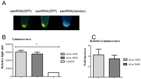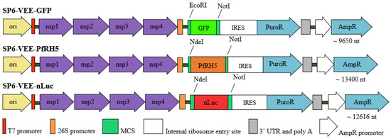16], modified by adding the protein of interest, nanoluciferase, as an amplified PCR product, and SP6-VEE-GFP (ADDGENE: Plasmid #58976). The self-amplifying RNA (samRNA) of SP6-VEE-nLuc and SP6-VEE-PfRH5, the products of subcloning with the enzymes NotI and NdeI, are shown in