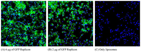 4 cells/well. The cells were transfected with liposomes at an 8 nM molar ratio with 6 µg and 2 µg of RNA replicons expressing GFP, and a control well was transfected only with liposomes. Transfection was performed in the same manner as in