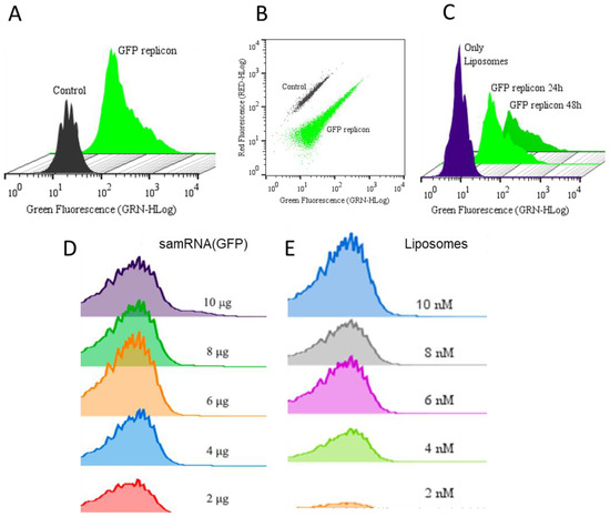 For transfection, Vero and HEK293T cells were seeded at a density of 104 cells/well, and grown overnight in a 24-well plate. Liposomes at either 4 nM with 2 µg of RNA replicons had their final volumes adjusted with 5% glucose to 50 µL per well, resulting in 1 µg of RNA replicon per mL in each well. Therefore, 50 µL of the formulation was pipetted over the cells, and DMEM medium was added to a final volume of 2 mL per well. After incubation in the presence of liposomes for 24 h, the cells were washed with incomplete RPMI medium, trypsinized, and resuspended in 100 µL of DMEM medium. Half of this volume was analyzed using a flow cytometer (Guava® EasyCyte Mini, Luminex, Austin, TX, USA), in the case of the GFP transfected wells, or using a luminometer (Berthold Lumat LB 9507, Bad Wildbad, Germany), in the case of nanoLuc transfected wells. DMEM was added to the cells, and the plates were incubated. Subsequent analyses were performed 48 h after transfection. The transfection efficiency of the GFP replicons and GFP was evaluated using flow cytometry, with excitation at 488 nm (FL1 filter) to detect the green fluorescent protein (GFP) in the transfected cells. The samples containing nanoLuc were treated with Brefeldin A (BD GolgiPlug™), according to the manufacturer’s instructions, 6–8 h before every analysis. The cells were pelleted at 18,800× g for 20 s (Eppendorf centrifuge) and resuspended in Nano-Glo® Luciferase Assay Substrate and Buffer, according to the manufacturer’s instructions, before analysis in the luminometer.