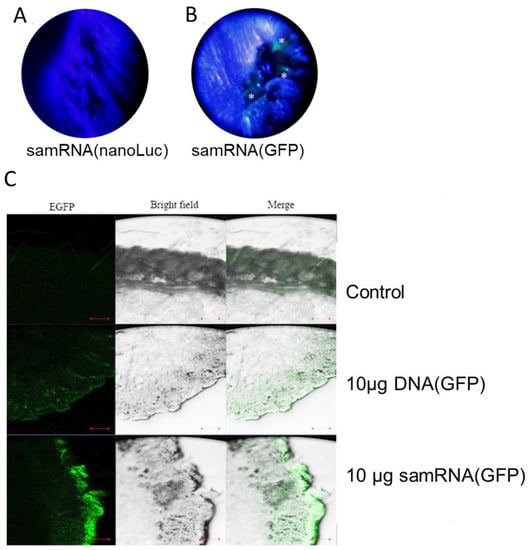 25], a large production of GFP was observed following the delivery of unmodified samRNA. Although a large amount of RNA (10 µg) was initially used, it can be assumed that only a small portion was effectively transferred to the skin. This probably occurred because a conventional tattooing machine was used, in contrast to previous studies in which specific multilayer tattooing delivery was more effective [
