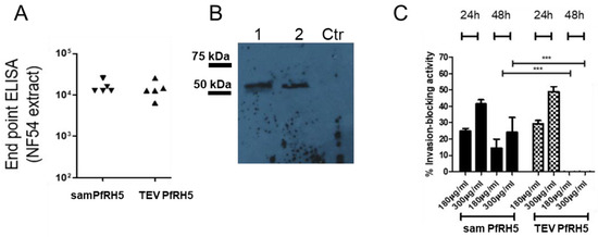 The obtained antiPfRH5 titers and their inhibitory effects were perfectly comparable in efficiency to previous results obtained by us [