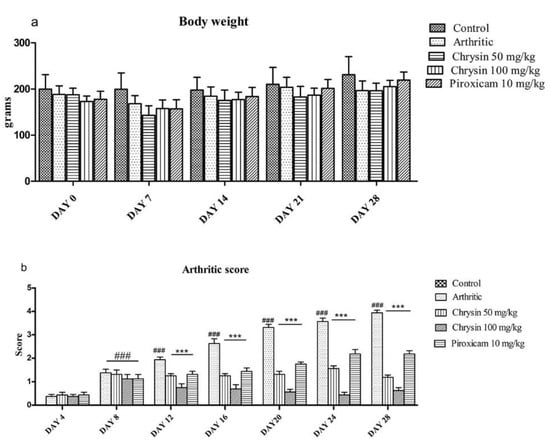 Rats were divided into five groups: control, CFA arthritis, CFA arthritis plus chrysin 50 mg/kg, CFA arthritis plus chrysin 100 mg/kg, and CFA arthritis plus piroxicam 10 mg/kg (n = 10 per group). Chrysin (97%) and piroxicam (≥98%) were purchased from Sigma-Aldrich (St. Louis, MO, USA). The chemicals used in this investigation were of the highest analytical quality. RA was induced by injecting 0.2 mL of CFA (Mycobacterium butyricum dissolved in mineral oil) into the sub-plantar region of the left hind paw in all groups, except the control group []. Rats in the control group were injected with the same volume of normal saline. Animals in the low and high chrysin treatment groups received intraperitoneal injections of chrysin 50 mg/kg and 100 mg/kg daily, respectively [,], dissolved in 0.1% dimethyl sulfoxide (DMSO) from day 8 after injection of CFA to day 27. The piroxicam treatment group received piroxicam 10 mg/kg dissolved in 0.1% DMSO from day 8 after injection of CFA to day 27 [].