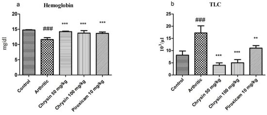 CFA caused a reduction in Hb levels in the arthritic group (11.63 ± 0.62) compared with the control group (14.76 ± 0.1). Chrysin 50 mg/kg (14.22 ± 0.15) and chrysin 100 mg/kg (13.73 ± 0.81) improved Hb levels after three weeks of treatment (p-value < 0.0001). These results were comparable with piroxicam 10 mg/kg (13.64 ± 0.47), as shown in Figure 2a. CFA caused a significant rise (p-value < 0.0001) in TLC in the arthritic group (17.27 ± 2.88) due to inflammation, compared with the control group (8.16 ± 1.66). Chrysin 50 mg/kg (4.01 ± 0.94) and chrysin 100 mg/kg (5.02 ± 1.29) improved inflammation and normalized TLC compared with the arthritic group. Piroxicam 10 mg/kg (11.02 ± 1.02) also caused a significant reduction in TLC (Figure 2b).