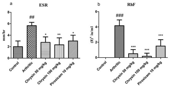 The results showed a significant rise (p-value = 0.0037) in ESR in the arthritic group (5.25 ± 0.95) compared with the control group (2.5 ± 1.2). There was a significant decrease in ESR in the chrysin 100 mg/kg treated (2.33 ± 1.2), chrysin 50 mg/kg treated (1.66 ± 0.81), and piroxicam treated (4.5 ± 0.57) groups compared with the arthritic group (Figure 3a). A significant rise (p-value < 0.0001) in RhF was noted in the arthritic group (33.3 ± 6) compared with the controls. After treatment with chrysin 100 mg/kg (3.3 ± 3), chrysin 50 mg/kg (5.3 ± 35), and piroxicam (12 ± 6), RhF was reduced significantly in all of the treated groups compared with the arthritic group (Figure 3b).