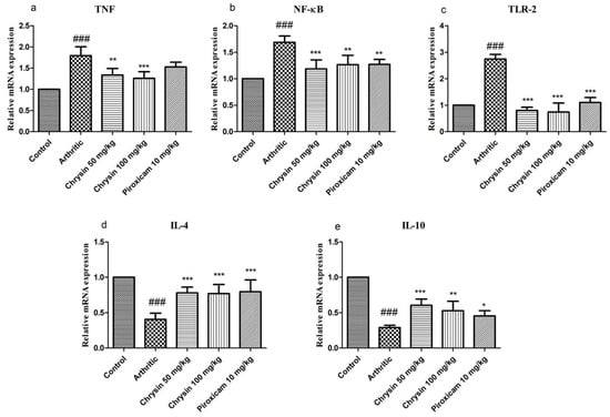 The immune system is stimulated by CFA, with a complex set of antigenic signals to the innate compartment of the immune system. The outcome is altered leukocyte proliferation and differentiation, and the release of pro-inflammatory cytokines []. The presence of mycobacteria in the CFA stimulates macrophages and dendritic cells by inducing TNF and IL-10. TLR-2 contributes to the recognition of gram-positive bacteria components and lipopolysaccharides [], while TLR-4 is involved in innate immunity. TLRs cause the activation of NF-κB, leading to the production of IL-1, IL-6, IL-8, and TNF []. TLR-2 has a vital role in the induction of apoptosis []. All chrysin- or piroxicam-treated groups showed a reduction in TNF, NF-κB, and TLR-2 levels after 21 days, but the results of high dose chrysin were better than those of low dose chrysin and piroxicam. Previous studies conducted on RA support these results [].