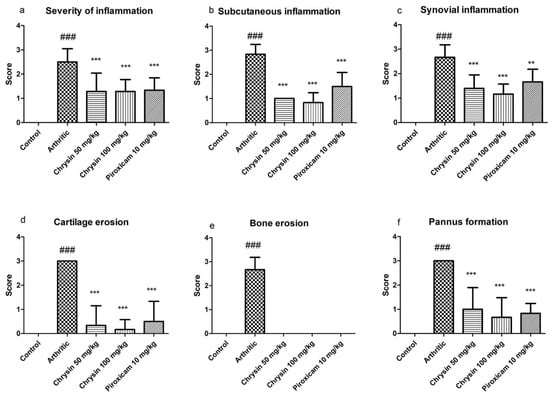 Histopathology slides had been examined for infiltration of inflammatory cells, synovial inflammation, subcutaneous inflammation, cartilage erosion, bone erosion, and pannus formation and were scored as normal, minimal, mild, moderate, and severe changes (scores 0, l, 2, 3, and 4, respectively). There was no sign of inflammation upon histology of the ankle joint of the ipsilateral rat paw in the control group, but the arthritic group showed significant changes (p ≤ 0.001) in the severity of inflammation, including the extent of the inflammatory cell infiltrate, subcutaneous and synovial inflammation, along with obvious cartilage and bone erosion and pannus formation. Chrysin and piroxicam decreased the signs of inflammation, but the chrysin 100 mg/kg treated group showed better results compared with the chrysin 50 mg/kg and piroxicam treated groups, as shown in Figure 5 and Figure 6.