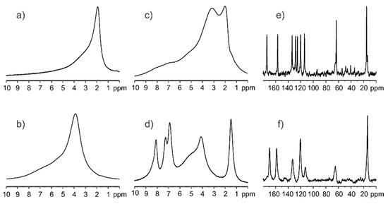 1H MAS NMR spectra for (a) calcinated silica kept 1h in the oven at 300 °C, (b) silica stored in a natural environment without special humidity control, (c) mixture of ET/SiO2(calc) with weight-to-weight ratio 1:3, (d) mixture of ET/SiO2(hydr) with weight-to-weight ratio 1:3 recorded with a spinning rate of 8 kHz. The 13C CP/MAS (e) and 13C SPE/MAS spectrum (f) for ET/SiO2(hydr) sample were recorded with a spinning rate of 12 kHz.