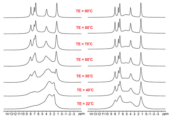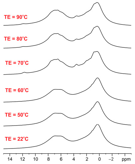As seen, the 1H MAS NMR spectra of ET with an increase in temperature up to 90 °C are very similar, which means that melting or phase transition processes do not occur during heating and sample spinning in the zirconia rotor. The 1H MAS spectra for ET mixed with silica are significantly different (see Figure 4). The left column shows spectra for ET/SiO2(calc) whereas the right column displays spectra for ET/SiO2(hydr). In the middle space, the temperature of the measurement is defined. From a comparative analysis of the spectra, it is concluded that water molecules play an important role in increasing the mobility of ET. The resolution of the proton spectrum for ET/SiO2(calc) at 70 °C is comparable with the spectrum of ET/SiO2(hydr) at 40 °C. Moreover, the resonance lines for ET/SiO2(hydr) are sharper compared to ET/SiO2(calc). At 90 °C, the full-width at half-height (FWHH) measured on methyl signals was found to be 130 Hz for ET/SiO2(calc), whereas, for ET/SiO2(hydr), it is equal to 98 Hz.