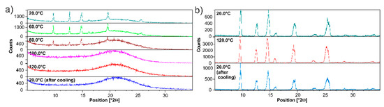 The results presented in Figure 5d were further verified by employing the diffraction technique. Figure 6a shows the variable temperature (VT) PXRD measurements of ET/SiO2(hydr). The sample was measured in the temperature range from 20 °C to 120 °C. The diffractogram at 20 °C has already been discussed in the previous section. An analysis of PXRD data shows that the bulge of the baseline in the range 2Θ 18–25, representing the amorphous phase, increases with an increasing temperature. At 80 °C, the reflexes coming from the crystalline ET phase are very weak. At 100 °C, only the bulge baseline is observed. The sample cooled down to room temperature does not show any reflexes representing crystalline ET, which means that amorphization is completed. It is worth noting that pure ET behaves dramatically differently (see Figure 5c). Figure 6b displays the diffractograms at temperatures of 20 °C and 120 °C. Even at a high temperature of 120 °C, no melting or phase transition was observed. In addition, we observed that the molten ET sample easily crystallizes at room temperature, forming crystals with a morphology known from X-ray studies of single crystals. Finally, as we mentioned above, ET is also one of the materials that sublimate, and weight loss is noted when heated. By using silica as an amorphizing agent due to the decrease in the thermal transition temperature, the API is partially protected against this effect.