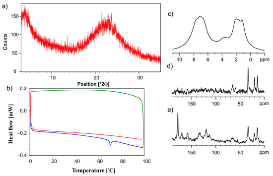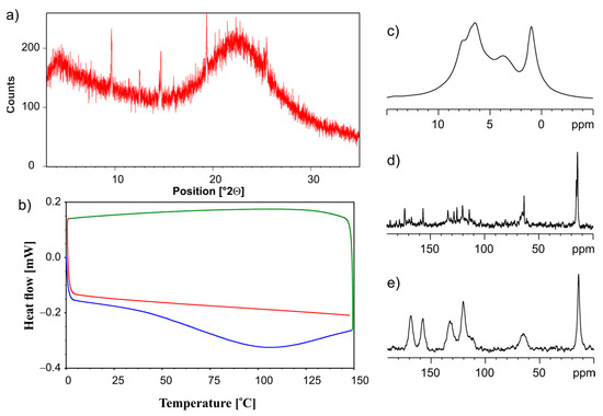 (a) PXRD recorded on a PANalytical 3 kW system in Bragg–Brentano geometry and with a Cu Kα (λ = 1.5425 Å) source, (b) the DSC measurement. The first heating run from 0 °C to 150 °C (blue line), then a cooling run from 150 °C to 0 °C (green line), followed by a second heating run from 0 °C to 150 °C (red line), (c) 1H MAS, (d) 13C CP MAS, and (e) 13C SPE MAS NMR measurements recorded with a spinning rate of 12 kHz for the physical mixture of ET/SiO2(hydr) ground in a ball mill.
