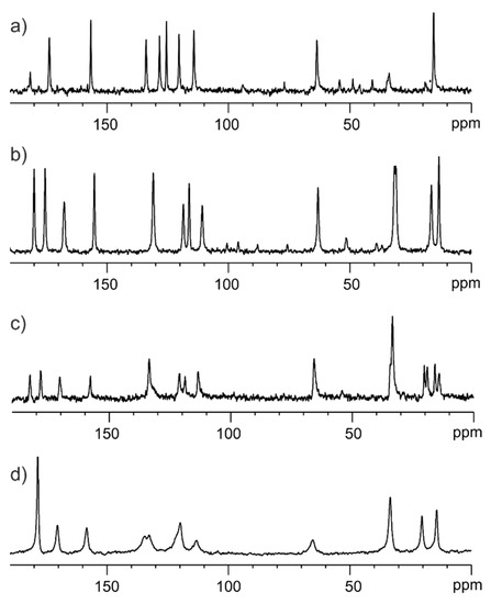 (a) 13C CP/MAS spectrum of physical mixture of ET and GLU, (b) 13C CP/MAS spectrum of well-defined ET:GLU cocrystal, (c) 13C CP/MAS spectrum of the physical mixture ET:GLU cocrystal and SiO2(hydr) with a weight-to-weight ratio of 1:3, (d) 13C SPE/MAS spectrum of the ET:GLU/SiO2(hydr) physical mixture (1:3) recorded with a spinning rate of 12 kHz.