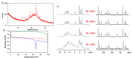 Figure 9 shows the PXRD, DSC, and VT NMR data for the physical mixture of the ET:GLU cocrystal and SiO2(hydr). Diffractograms shown in Figure 9a reveal that the freshly mixed sample contains the crystalline ET:GLU components and amorphous phase; however, after melting and cooling, the sample is amorphous, as shown by DSC studies. (Figure 9b). The first run (blue line) shows the melting of the cocrystal at 69 °C. During the cooling (green line), the recrystallization of ET:GLU is not observed. The full amorphization is confirmed by the second run (red line). 1H MAS (Figure 9c, left column) and 13C SPE MAS (Figure 9c, right column) provide further evidence showing that, when increasing the temperature from 30 °C to 80 °C, the cocrystal is in a molten state.