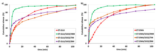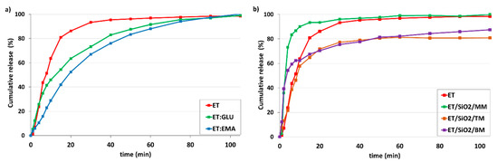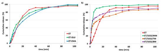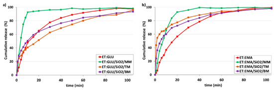 Finally, it should be stressed that the change in environmental conditions does not significantly affect the release profiles. At pH 1.2 (Figure 14), similar trends were observed to when at pH 5.7. The release of ET from the ET:GLU/SiO2/MM and ET:EMA/SiO2/MM is faster compared to other samples.
