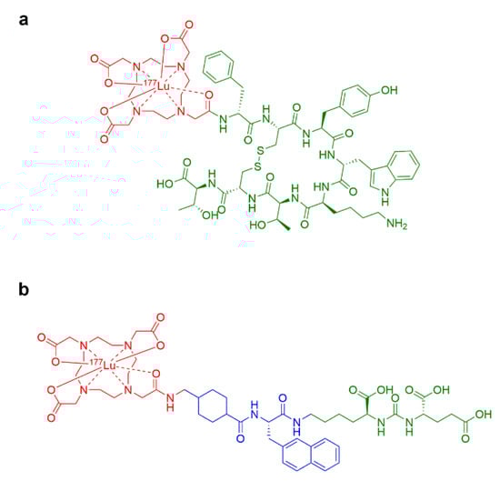 The first application of 177Lu labelled radiopharmaceuticals that have reached the clinics is based on peptide ligands referring to a theranostic approach called peptide receptor radionuclide therapy (PRRT). PRRT is a targeted therapeutic strategy using radiolabeled peptides as targeting vectors designed to deliver cytotoxic levels of radiation dose at the level of the corresponding receptor overexpressed by cancer cells [,]. After two decades of clinical investigations in PRRT, it still raises interest because of its ability to treat with high sensitivity and specificity at the molecular level. The first clinical application of 177Lu based PRRT was designed to target cancers that overexpressed somatostatin receptors type 2 (SSTR2) []. This target is of major interest in neuroendocrine tumors where it is largely overexpressed by cancer cells. The radiotheranostic approach targeting SSTR2 is based on the therapeutic radiopharmaceutical [¹⁷⁷Lu]Lu-DOTATATE (Figure 1a) and its diagnostic counterpart embedding the positron emitter Gallium-68 (68Ga) named [68Ga]Ga-DOTATATE or [68Ga]Ga-DOTATOC. The radiotheranostic pair 177Lu/68Ga is currently a well-established couple of radionuclides with widespread use in clinical radioligand therapy. In 2017, Strosberg et al. published the results of a randomized controlled clinical trial aiming to evaluate the efficacy and safety of [¹⁷⁷Lu]Lu-DOTATATE in patients with advanced midgut neuroendocrine tumors. From an efficacy point of view, they showed that patients treated with [¹⁷⁷Lu]Lu-DOTATATE presented a longer progression free-survival and a significantly higher response rate than patients treated with the best supportive care alone. From a safety point of view, clinically significant myelosuppression occurred in fewer than 10% of patients treated with [¹⁷⁷Lu]Lu-DOTATATE []. In 2018, [¹⁷⁷Lu]Lu-DOTATATE received approval from both the U.S. Food and Drug Administration (FDA) and the European Medicines Agency (EMA) under the commercial name Lutathera® (Advanced Accelerator Applications, a Novartis company).