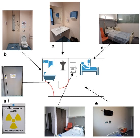 Scheme and photos of a radioprotected room in the therapy department of the Hospices Civils de Lyon, France. (a) Shielded door with zoning of the room (according to the different activities performed, here, the yellow controlled zone in the room was due to Iodine-131 therapy activity). (b) Shower with toilet connected to decay tanks for waste disposal. (c) Wash basin (connected to the decay tanks only due to Iodine-131 therapy activity). (d) Bed with single-use sheets. (e) Posting in the room and bathroom of the radiation protection rules for patients.