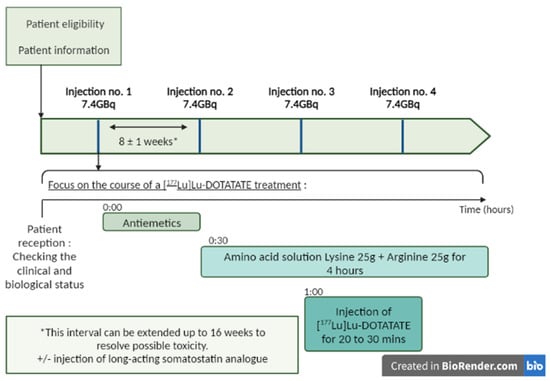 Treatment process for Lutathera®: four infusions of [177Lu]Lu-DOTATATE every 8 weeks (±1 week). Lutathera® administration should be preceded by an infusion of antiemetics and amino acids. The antiemetics were infused before the amino acids. The amino acids should be administered 30 min before [177Lu]Lu-DOTATATE and continue during treatment (see Section 2.3 for the details of premedication) For some patients, a long-acting somatostatin analog (Sandostatin LAR) may be administered intramuscularly (i.m.) every 3 to 4 weeks. A short-acting somatostatin analog may be used but should not be administered for 24 h prior to treatment with [177Lu]Lu-DOTATATE. Created in Biorender.com.