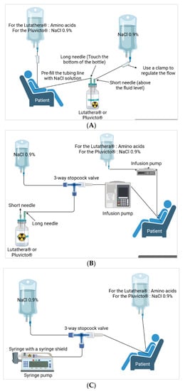 Different methods of administration are reported and the three main ones are presented herein (Figure 4) []. Variations exist but we will not dwell on them here. For gravity administration, during the infusion, the flow of the 9 mg/mL (0.9%) sodium chloride infusion solution increases the pressure in the Lutathera® vial, which facilitates the flow of Lutathera® into the catheter inserted in the patient’s peripheral vein. The amino acid solution is passed through another catheter in the patient’s other arm. For the pump and vial method, the pump is set to deliver the volume of [¹⁷⁷Lu]Lu-DOTATATE over 25–30 min. The [¹⁷⁷Lu]Lu-DOTATATE is delivered in 20–25 mL of volume, resulting in an administration rate of 0.8–0.9 mL/min. Then, there is the pump method with a syringe that will be inserted into a syringe guard. At the end of the infusion, the therapy bottle is rinsed with sterile saline solution [,,,,]