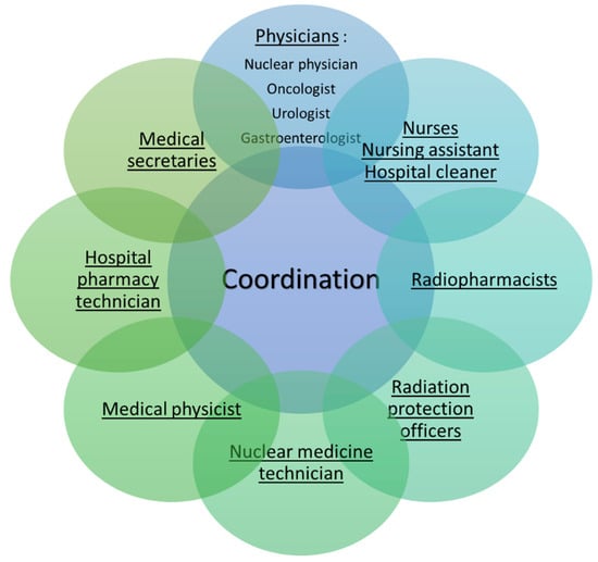 In addition, the use of 177Lu requires the implementation of a quality management system aimed at preventing and managing the risks associated with 177Lu exposure. This system must implement the principles of justification and optimization to always be in accordance with the ALARA principle. It must not only include quality assurance in radiation protection [], but also safe procedures that must be available for all unsealed radiopharmaceutical sources and that cover the required instrumentation, calibration and frequency, ordering and receipt of these products, the content of patient records, and the use and disposal of the wastes of these therapeutic radiopharmaceutical products [].