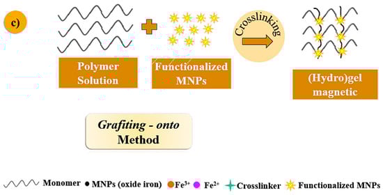 In the grafting-onto method, covalent bonds are formed between the gel network and the NPMs, grafting several functional groups at the surface of the MNPs; these function as nano-crosslinkers to form a covalent coupling with the monomers when polymerized [,,]. Among the mentioned methods, this one has a complex manufacturing process, a long preparation cycle, and a high cost, which all limit its applications.