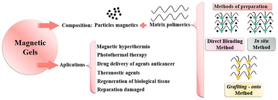 Three methods are distinguished in the literature for the preparation of magnetic gels: (i) the direct blending method; (ii) the in situ method; and (iii) the grafting-onto method [,,,,]. The method for preparing the gel is based on the properties of the MNPs and the polymeric network of the gel, as well as on the homogeneity of the concentration and distribution of the NPs in the gel [,,].