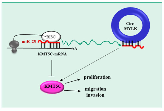 circ-MYLK, Gao et al. [101]. This circular RNA sponges miR-29, which can then no longer target histone lysine N methyltransferase 5C (KMT5C), thus allowing KMTC5 to promote cell proliferation and migration.