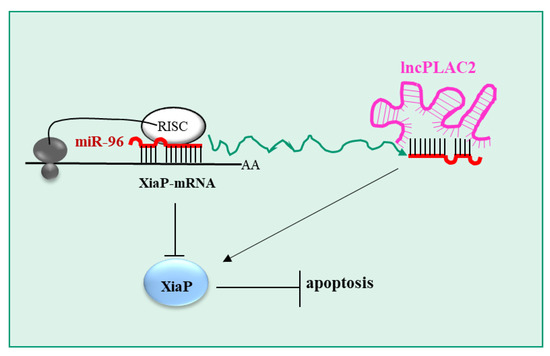 lncPLAC2, Wang et al. [120]. This lncRNA sponges miR-96, thus preventing its inhibitory effect on the X-linked inhibitor of apoptosis protein (XiaP), a known anti-apoptotic protein. This mechanism contributes to explaining the induction of resistance against the drug cisplatin.
