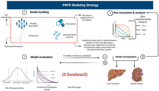 An organized workflow was adopted to build up a PBPK model beginning with extensive online research using Google Scholar and PubMed to collect the reported values pertaining to drug-related parameters (MW, lipophilicity log P, fraction unbound fu, B/P ratio, drug solubility) that may have an impact on systemic drug exposure. After that, the respective parameters were incorporated into the PK-Sim® simulator together with the simulation’s relevant anatomical and physiological data, based on the presence of systemic concentration-vs.-time profiles of HCQ in the published literature. Each profile has a self-governing simulation based on the characteristics (origin, age, weight, female %) found in the published data. The previously reported systematic model-building approach was used in developing and evaluating the HCQ PBPK model [,,,]. Modeling was initiated by creating 100 virtual adults after IV administration protocol, where the absorption process was neglected to avoid the complicated steps associated with the gastrointestinal system. After the simulation ends, the simulator generates a time-versus-concentration profile and non-compartmental analysis (NCA) data that can be used for model evaluation. When the IV model was effectively developed and evaluated, oral PK profiles were cast into place by considering the compound’s absorption. After all developed simulations had been assessed in healthy adults, the model was extrapolated to liver cirrhosis and CKD by incorporating the respective pathophysiological changes. The schematic diagram for model designing can be seen in Figure 1.