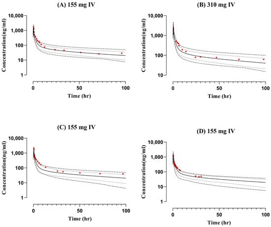 Comparison of observed and predicted blood-concentration–time profiles after intravenous administration of doses (A) 155 mg [], (B) 310 mg [], (C) 155 mg [], (D) 155 mg []. Solid lines are presented as mean, dashed lines as minimum, maximum, dotted lines as 5th–95th percentile and red-filled circles as observed data.