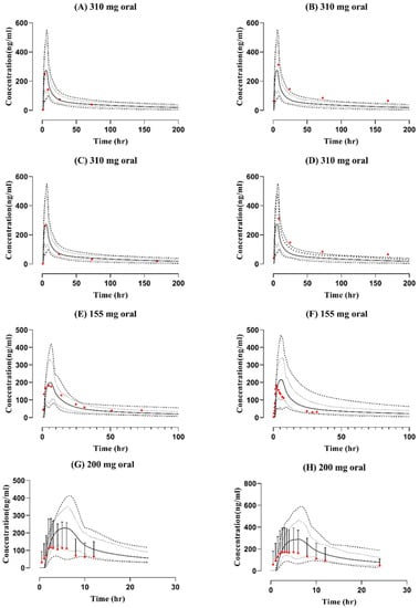 Observed and predicted blood concentration-time profiles comparison after oral administration of dose (A) 310 mg [], (B) 310 mg [], (C) 310 mg [], (D) 310 mg [], (E) 155 mg [], (F) 155 mg [], (G) 200 mg [], (H) 200 mg []. Solid lines are presented as mean, dashed lines as minimum, maximum and dotted lines as 5th–95th percentile and red-filled circles as observed data.