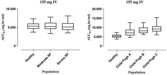 After extrapolating the healthy model to liver cirrhosis and CKD population, model predictions were made following IV administration of 155 mg. In liver cirrhosis, the median (95% confidence interval (CI)) for AUC0-t in healthy is 5317 (5142–5532), which increased to 7096 (6465–7528) in CP-A, 8176 (7772–8650) in CP-B, and 9204 (8645–9709) in CP-C, whereas for CKD, the value in the healthy population is 5317 (5142–5532) and decreased to 5187 (4904–5519) in moderate renal failure and 5088 (4665–5466) in severe renal failure. The box plots depicting these changes can be seen in Figure 4.