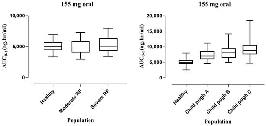 After oral administration of 155 mg dose, the model was extrapolated from healthy to liver cirrhosis and CKD populations. The values of the median with 95% CI for AUC0-t in the healthy population was 4989 (4812–5245), which increased to 6966 (6488–7600) in CP-A, 7961 (7171–8600) in CP-B, and 8735 (8449–9632) in CP-C, whereas for CKD the value in the healthy population was 4989 (4812–5245) and decreased to 4890 (4539–5235) in moderate renal failure and 4961 (4603–5342) in severe renal failure. The box plots showing these changes can be seen in Figure 5.