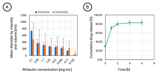 However, when calculating the particle diameter by volume, the size decreased to 8 nm, which indicates that a certain fraction of rifabutin has been solubilized by albumin, which now predominantly occurs in the monomolecular form. An illustration of this disassembly is presented in Figure 2 (right). This certainly affects the biodistribution patterns of these nanoparticles after injection. On the contrary, the size of rifabutin-loaded PLGA nanoparticles was not affected by the dilution and remained within the initial size range (Table 1). The drug release of these nanoparticles was further tested in 0.15 M PBS supplemented with 0.1% ascorbic acid (Figure 1B). Approximately 80% of the drug was released within the first two hours. Ascorbic acid is an antioxidant and inhibits the oxidation of rifabutin, a common process observed for other rifamycin derivatives as well [16,17].