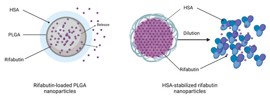 Structure of the two formulation prototypes including rifabutin-loaded PLGA nanoparticles (left) and HSA-stabilized rifabutin nanoparticles (right). While the PLGA particles provide a stable matrix structure, HSA-stabilized rifabutin nanoparticles disassemble into smaller particles when diluted with water. Created with BioRender.com. https://app.biorender.com/ (accessed on 22 February 2023).