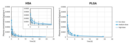 Our comparison of the plasma pharmacokinetics at multiple dose levels in rabbits involved rifabutin-loaded PLGA nanoparticles and HSA-stabilized rifabutin nanoparticles. Drug exposure has a strong impact on metabolism and distribution but also changes the absolute drug concentrations. Accordingly, we carried out our comparison based on the dose fraction per milliliter (µg/µg∙mL−1). The resulting fraction-scaled pharmacokinetic profiles are presented in Figure 4.