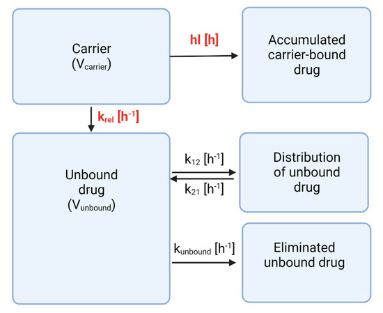 Illustration of the PBNB model that was used for the compartmental analysis (hl = Carrier half-life; krel = Release rate of doxorubicin in vivo; Vcarrier = Volume of distribution of the carrier; Vunbound = Volume of distribution of doxorubicin; k12, k21 = Circulation and recirculation rates of doxorubicin into the periphery; kunbound = Elimination rate of doxorubicin).